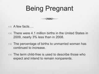 The percentage of births to unmarried woman has continued to increase. In this case Lilly is a surrogate mother The term now used to describe those who expect and intend to remain nonparents is child free Femme. Nonparent Nelson Kuslev and Lyubomirsky note includes 20-year-olds who will eventually become parents married couples who are struggling with infertility and elderly couples who were childless by choice.